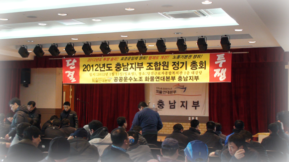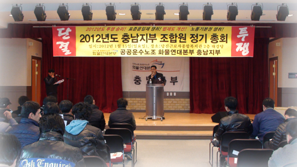 총회에서는 충남지부 11년도 사업보고, 12년도 투쟁계획과 화사법 및 표준운임제 쟁취를 위한 투쟁계획 설명회가 있었습니다.