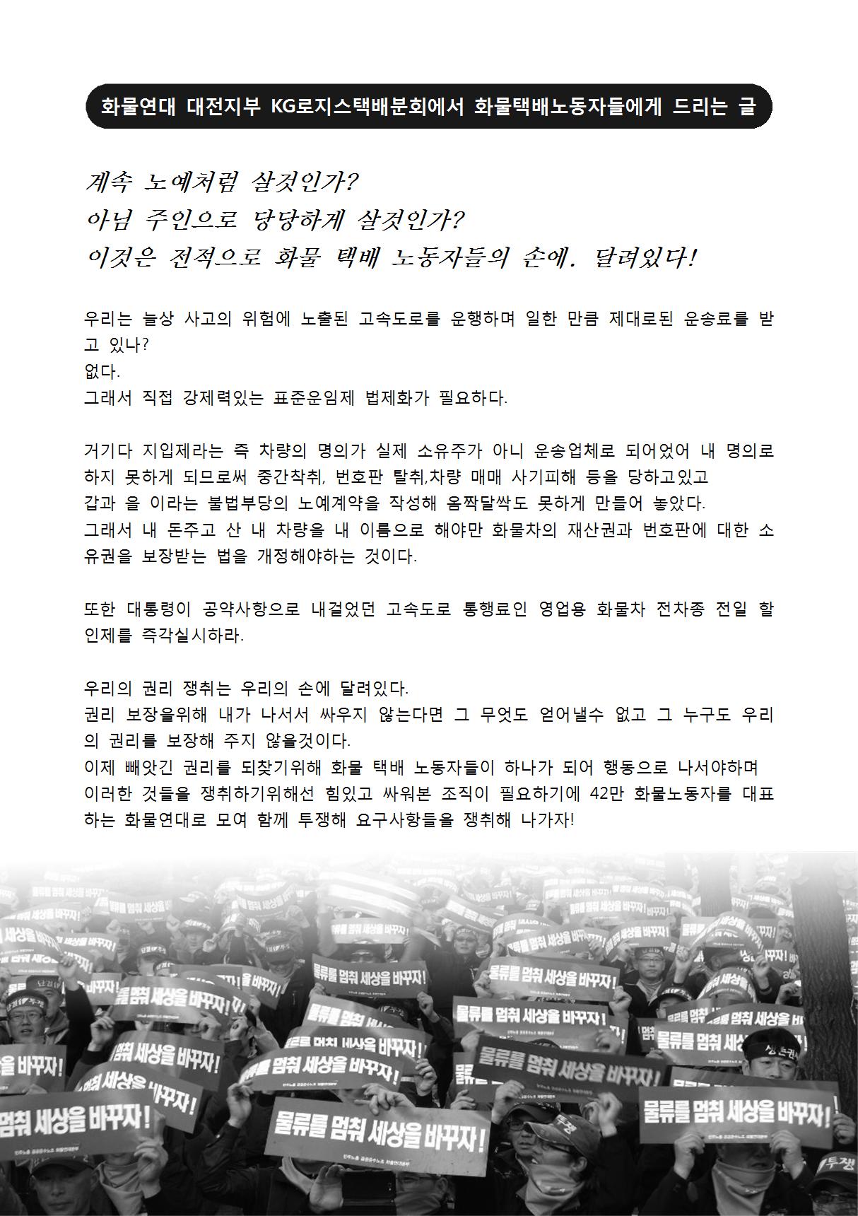 KG로지스택배분회 유인물 페이지 정보 작성자 서민선 댓글 0건 조회 7,443회 작성일 15-06-24 11:02 목록 본문 지난 6월10일 배포된 유인물 이전글KG로지스택배분회 유인물(대시민용) 15.06.26 다음글KG로지스택배분회 투쟁은 시작되었습니다!! 15.06.24 댓글 0 댓글목록 등록된 댓글이 없습니다.
