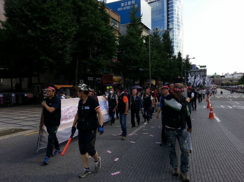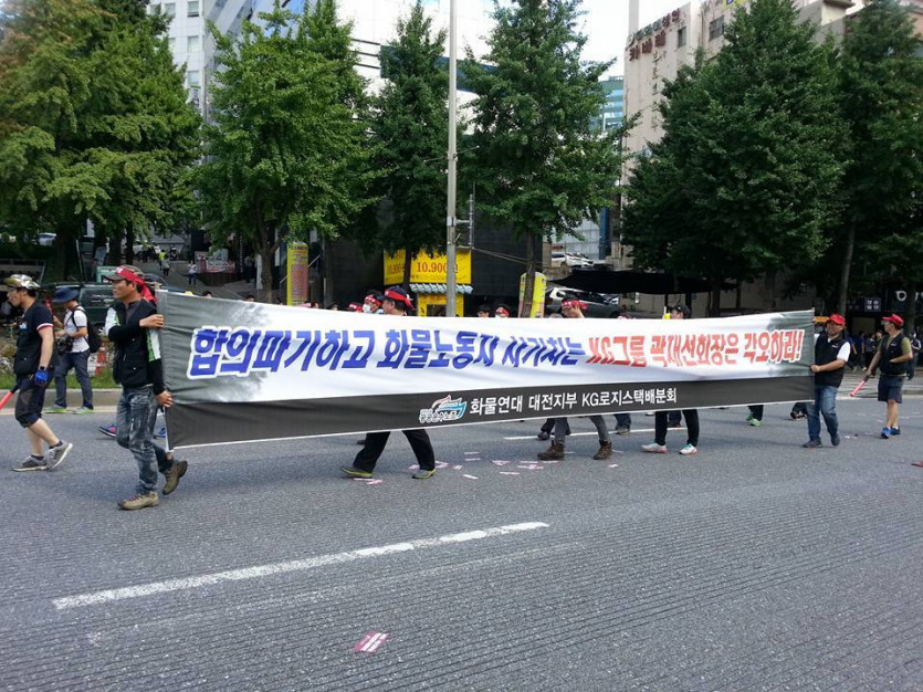 택배노동자들의 뒤통수 치고 길거리로 내몬KG로지스 택배 물류자본을 폭로하기위해 서울역 전국 노동자 대회에 참가한 분회 조합원들.