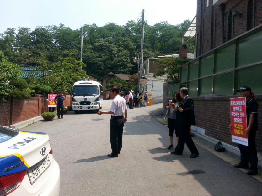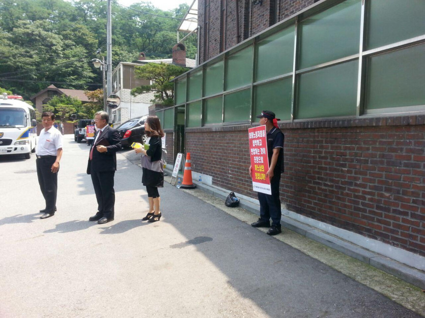KG그룹 곽재선회장을 규탄하며 곽회장이 다닌다는 교회앞에서 선전전을 진행하고 있습니다.