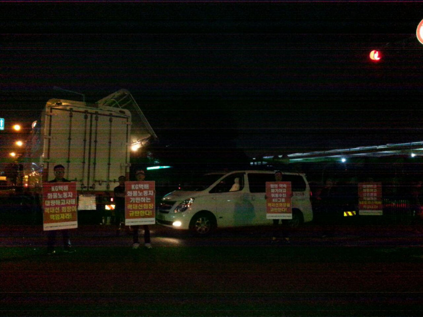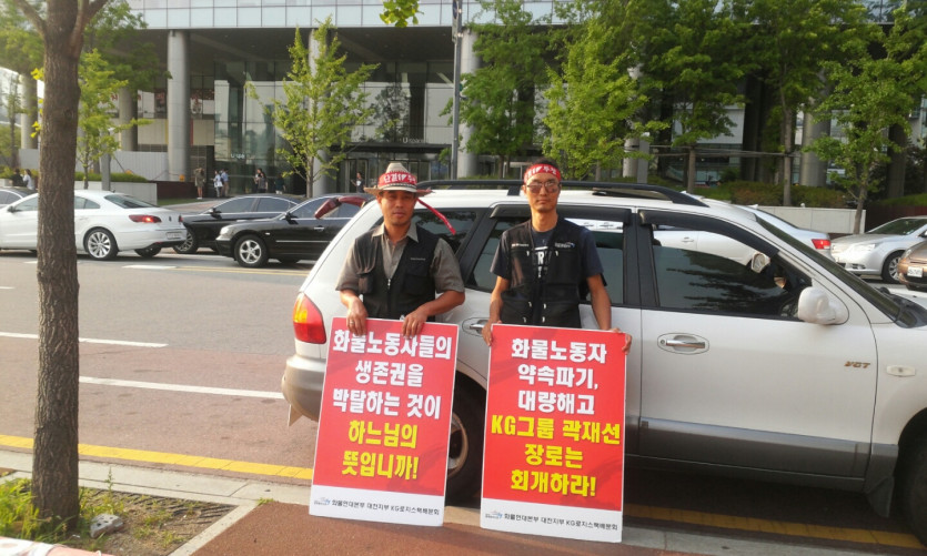 이후 사측에 정문 진입차들이 서행 운전할것과 최병선 KG로지스택배 대표의 사과를 요구하며 농성진행.