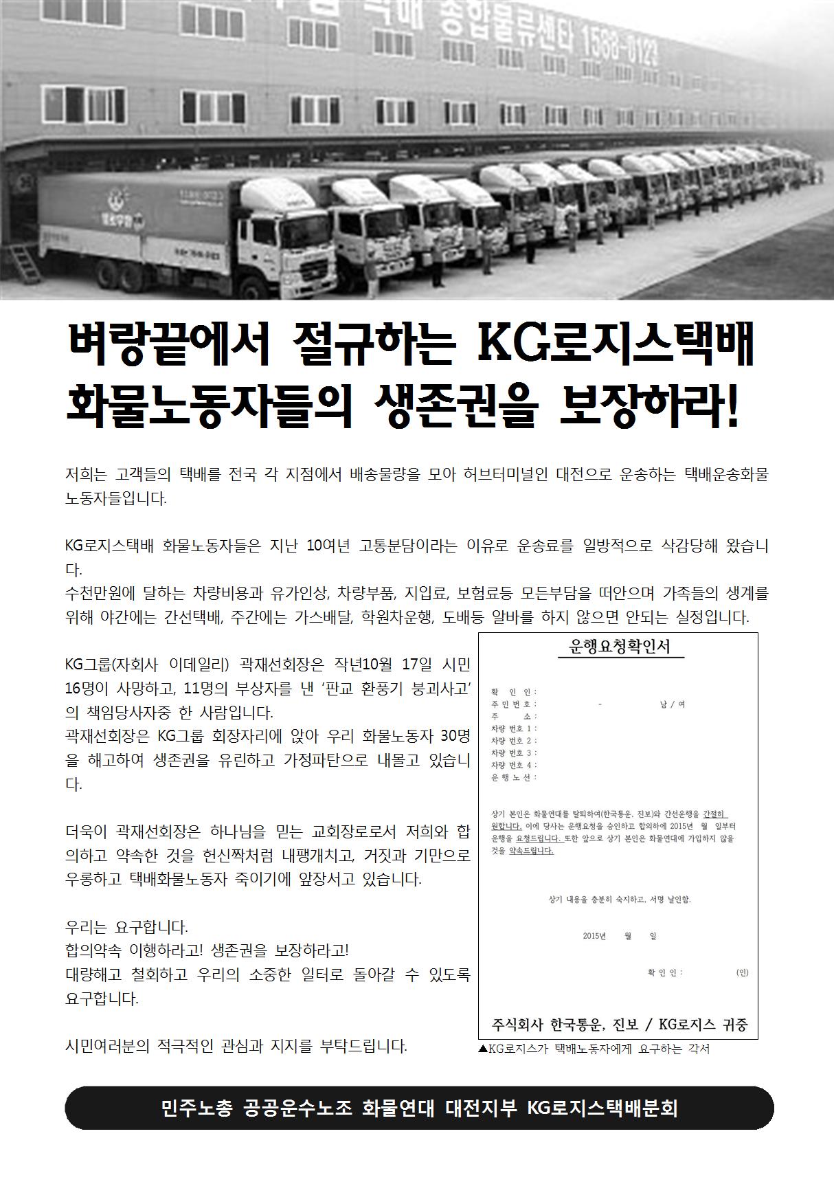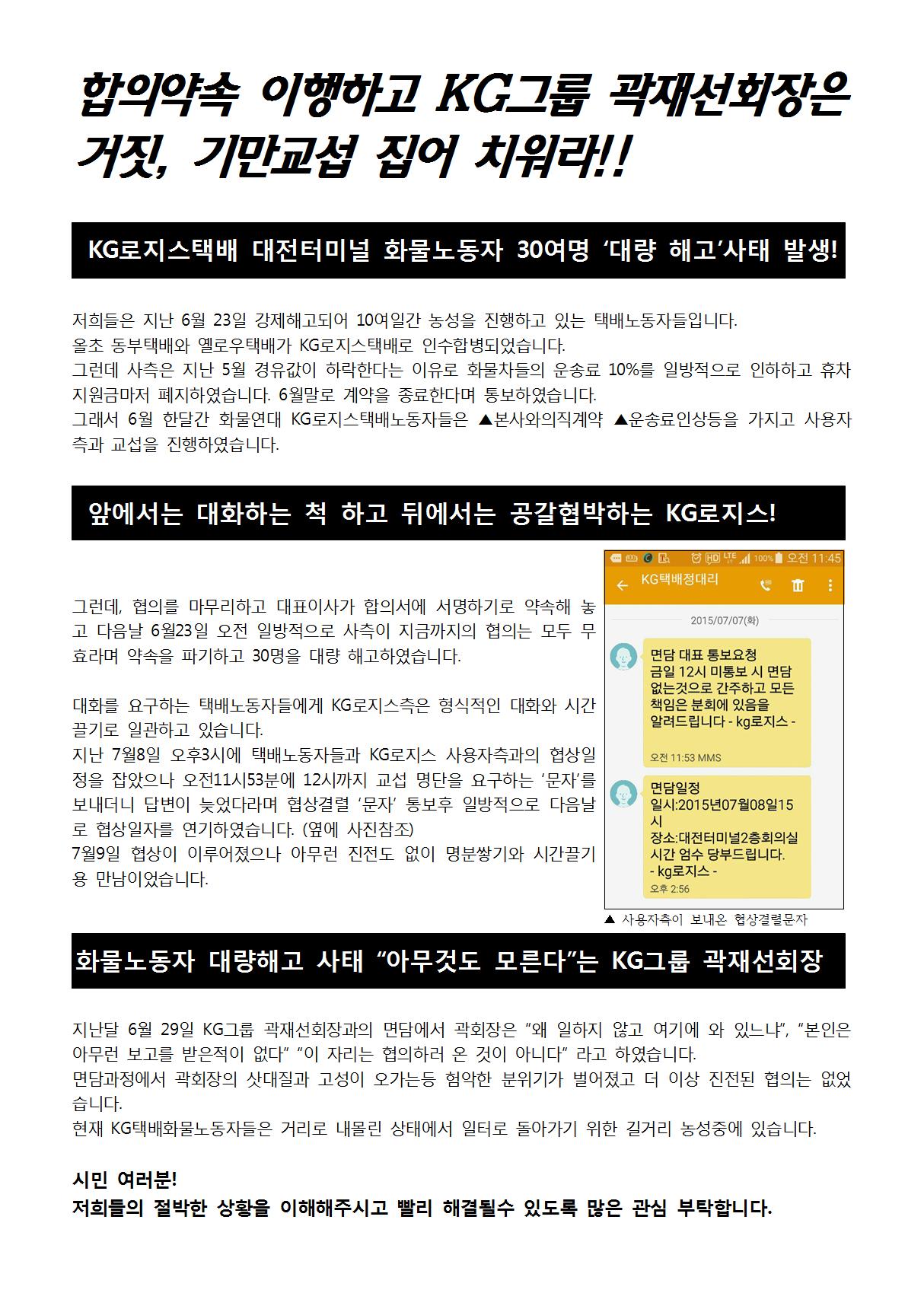 [선전물]KG택배분회 상경투쟁 선전물 페이지 정보 작성자 서민선 댓글 0건 조회 6,918회 작성일 15-07-10 09:46 목록 본문 유인물 이전글KG로지스 사측의 각서 15.07.10 다음글KG택배 해고투쟁 17일차 15.07.10 댓글 0 댓글목록 등록된 댓글이 없습니다.