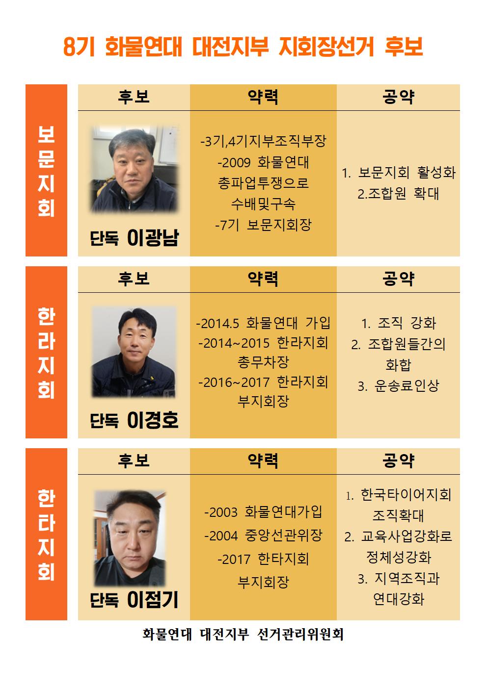 [지회장선거] 대전지부 지회장 후보 웹포스터 페이지 정보 작성자 서민선 댓글 0건 조회 10,704회 작성일 17-11-21 09:58 목록 본문 . 이전글[투표소안내]화물연대 8기총선거 대전지부 투표소안내 17.11.27 다음글[선거공고] 8기 대전지부 지회장 후보등록공고 17.11.20 댓글 0 댓글목록 등록된 댓글이 없습니다.