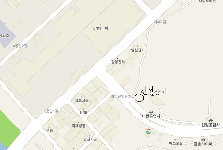 약도에서 "과학산업단지길"에 '길'자 옆이 안성상사입니다.