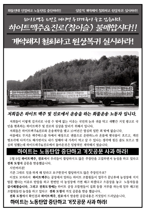 하이트불매 선전물 페이지 정보 작성자 라은숙[전북사무부장] 댓글 0건 조회 12,554회 작성일 09-02-17 13:49 목록 본문 하이트불매 선전물 이전글[펌]5월14일자 새전북신문-권영창전주지회장 인터뷰 와 화물연대노동자들 09.05.15 다음글컨테이너선 운항...화물운송업계 반발 예고 09.01.16 댓글 0 댓글목록 등록된 댓글이 없습니다.