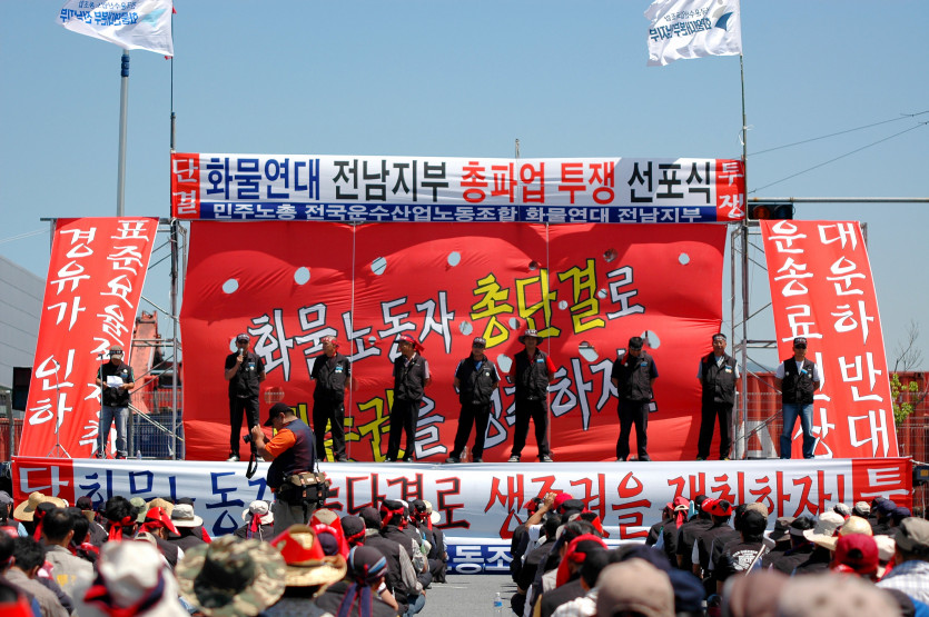 12일 13시 광양 컨테이너 부두에서 전남지부 전조합원과 화물노동자들이 참석한 가운데 힘찬 파업 출정식을 진행하였습니다, 끝까지 싸워서 반드시 승리하는 선봉 전남지부가 되겠습니다,, 투---쟁