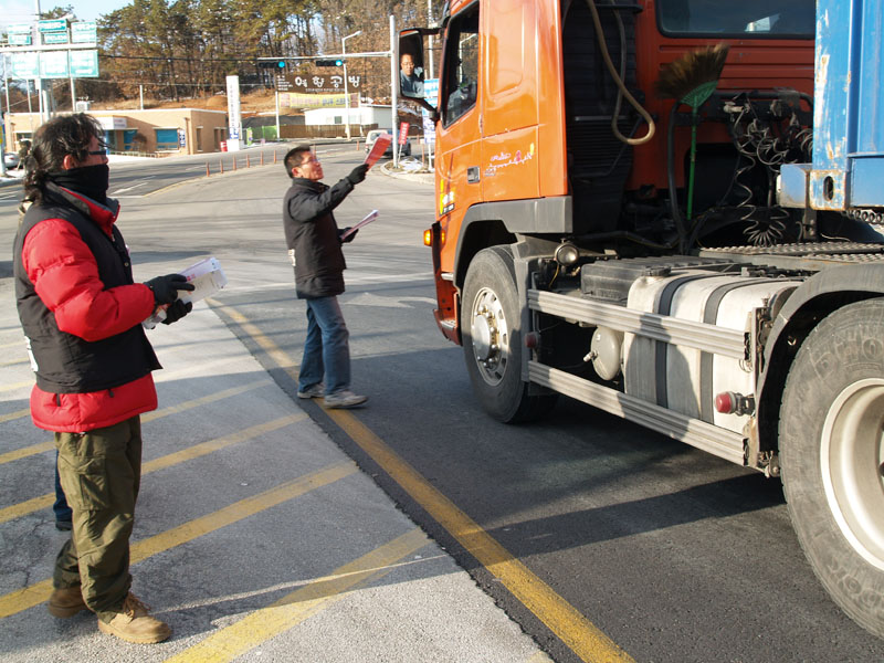 이날 집중선전전에는, 2지회 동지들이 많이 참여해 주셨습니다. 특히, 긴머리 휘날리며 유인물을 돌리는 2지회장님과 화물노동자 한명이라도 더 작금의 현실을 알리려는 2지회 총무차장님의 모습은 이날의 포토제닉, 모범이었습니다.