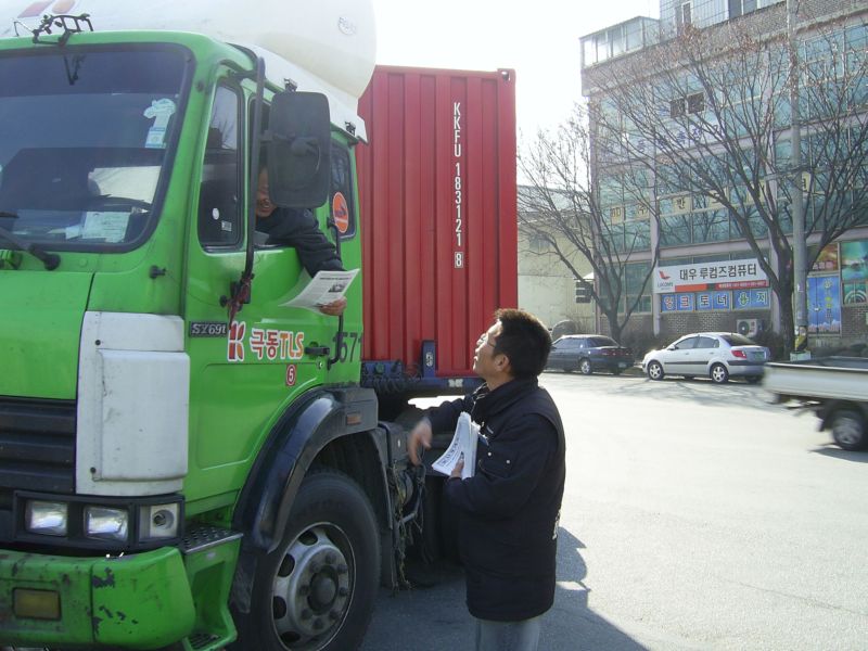 광주지부 소식지 <화물광주> 창간호를 동지들에게 나누어 주면서 작년 10월 출범 이후 진행했던 광주지부 사업과 투쟁에 대해 얘기하고, 지금 현장 곳곳에서 자행되고 있는 사측의 운송료 인하 책동의 본질과 향후 대책에 대해 짧게나마 동지들과 의견을 나누었습니다.