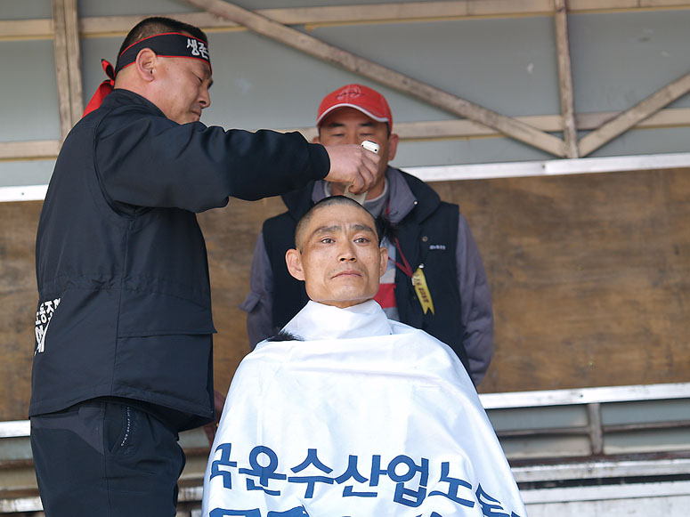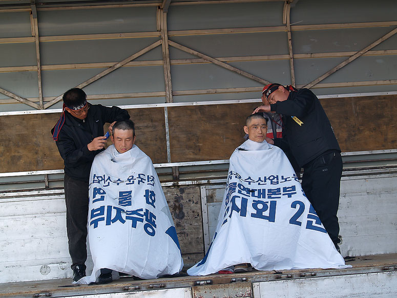 그리고 바로 김의선 금호지회장과 김성룡 대한통운택배분회장의 삭발식이 숙연한 분위기에서 거행되었으며, 두 동지의 삭발식을 지켜보는 수많은 동지들의 눈빛은 대한통운 자본에 대한 적개심과 가열찬 투쟁에 대한 각오로 빛났습니다.
