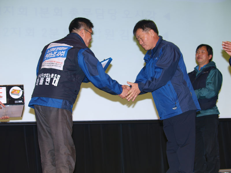 모범조직상은 1지회 카캐리어분회가, 모범조합원상은 오시강 동지, 김원섭 동지, 추재호 동지, 김영복 동지, 최일현 동지가 시상하였습니다.