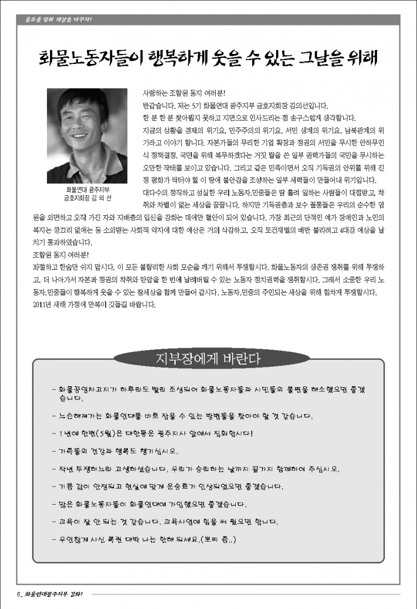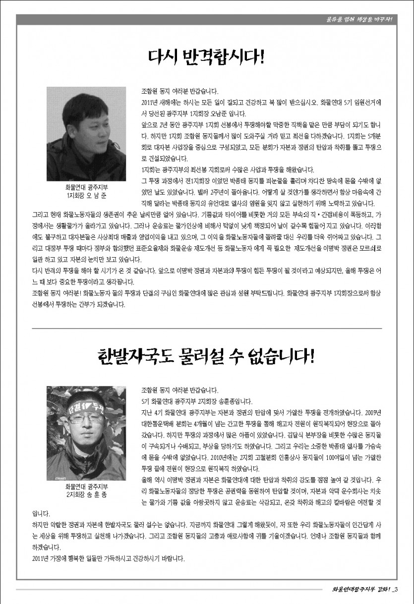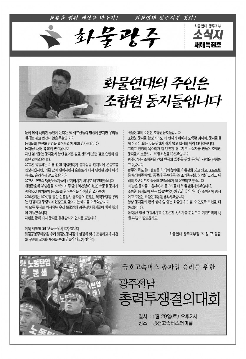 광주지부 소식지 <화물광주> 새해특집호를 발간하였습니다. 이번 새해특집호에는 지부장 및 각 지회장 새해 인사말과 2011년을 힘차게 준비하고 있는 금호지회 곡성분회장 유명석 동지의 인터뷰를 실었습니다. 그리고 2010년 광주지부의 사업과 투쟁을 사진으로 담았습니다.
