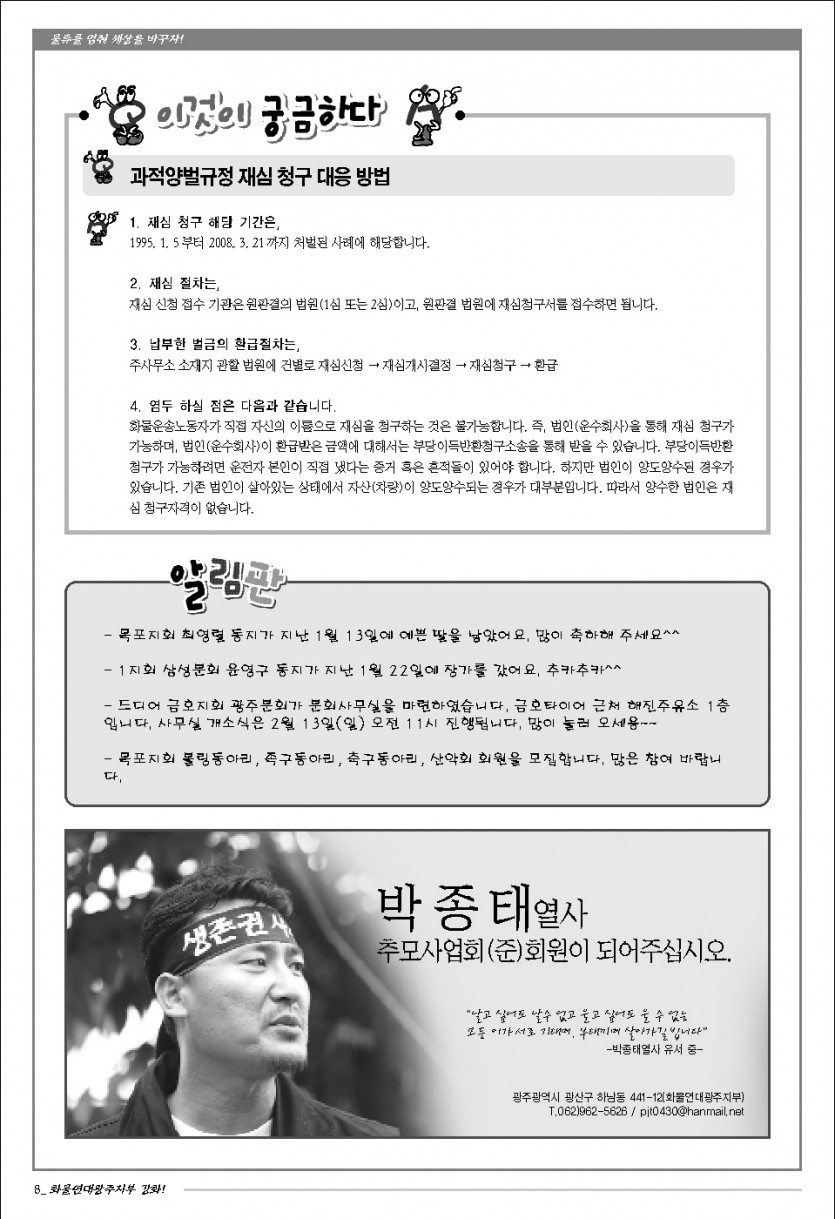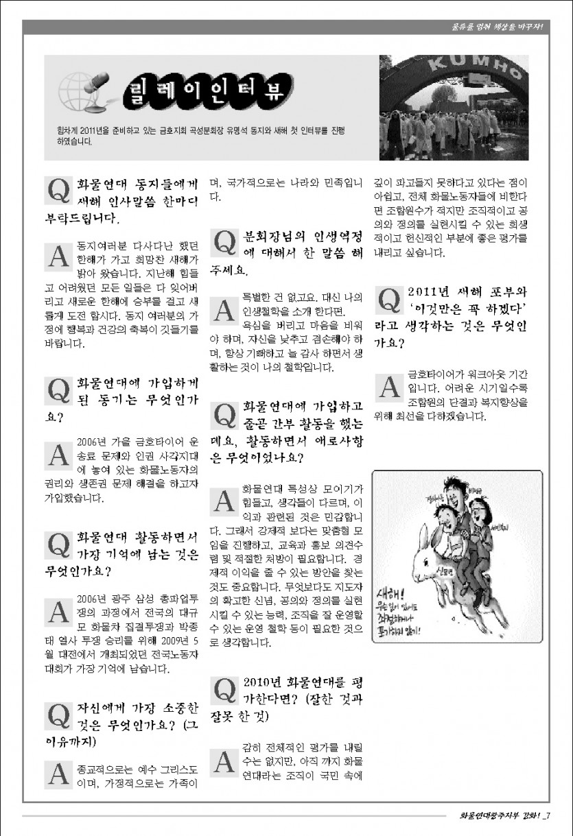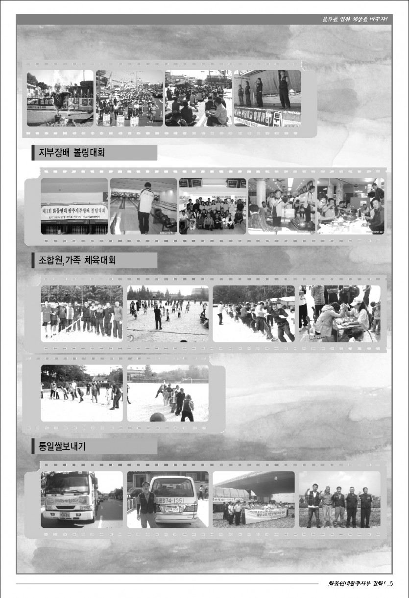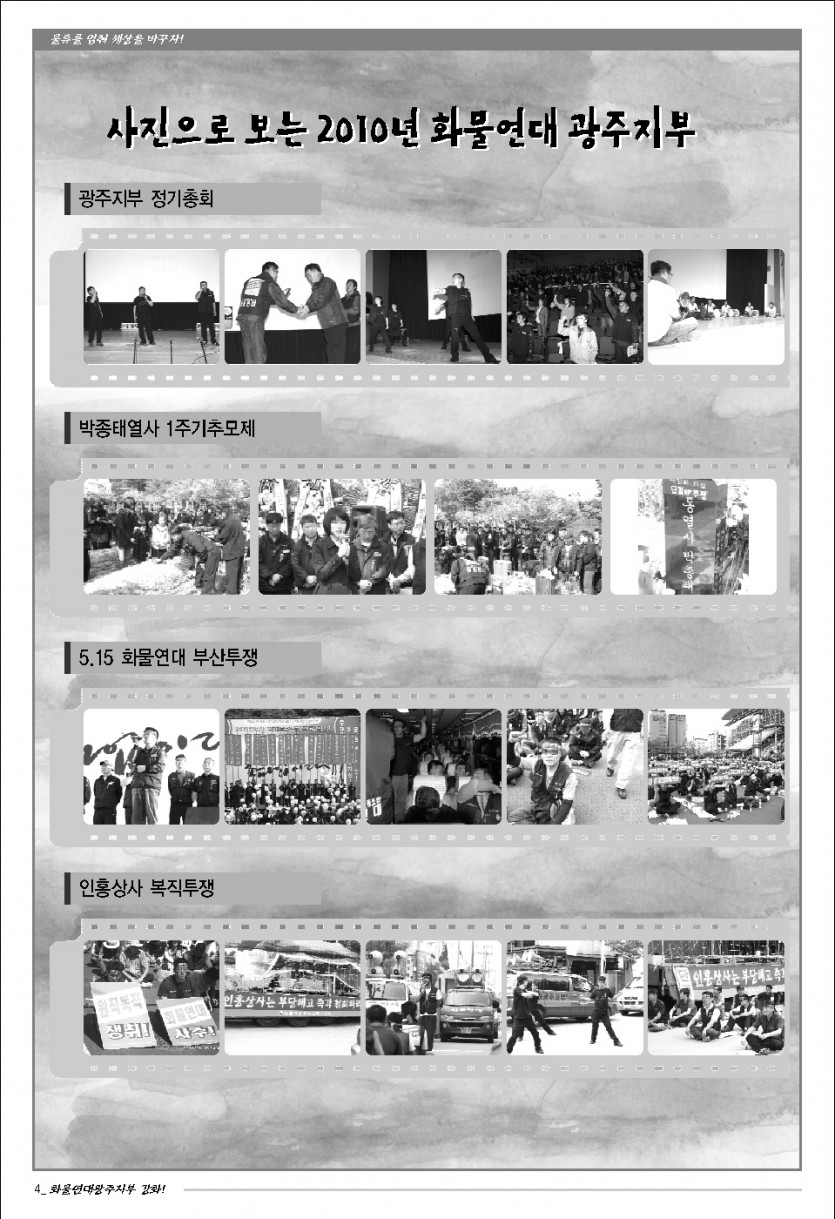광주지부 소식지 <화물광주> 새해특집호를 발간하였습니다. 이번 새해특집호에는 지부장 및 각 지회장 새해 인사말과 2011년을 힘차게 준비하고 있는 금호지회 곡성분회장 유명석 동지의 인터뷰를 실었습니다. 그리고 2010년 광주지부의 사업과 투쟁을 사진으로 담았습니다.