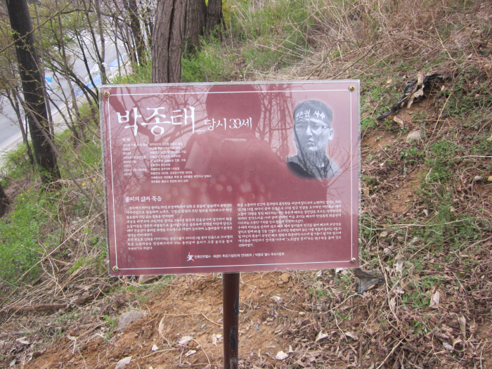 2009년 4월 30일 박종태열사가 자본과 정권의 탄압에 맞서 죽음으로 항거했던 대한통운 대전지사 건너편 아카시아 동산에 박종태열사 안내판을 설치했습니다. 박종태열사 2주기 추모기간(4월18일~4월30일)에 맞추어 많은 화물연대 동지들이 참배를 하고 박종태열사의 뜻을 기렸으면 좋겠습니다.