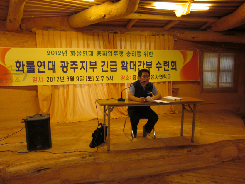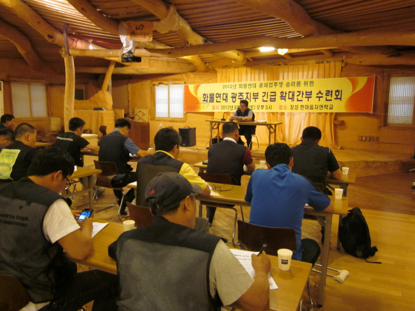 2012년 화물연대 총파업투쟁 승리를 위한 광주지부 긴급 확대간부 수련회가 지난 6월9일(토), 10일(일) 이틀간 장성 황토마을에서 진행되었습니다. 이번 수련회에는 50여명의 광주지부 확대간부들이 참석하였습니다. 입소식을 시작으로 첫번째 시간에는 '2012년 화물연대 요구안(최종)' 발제와 질의,응답을 진행하였습니다. 그리고 이어서 '2012년 총파업투쟁 제대로 준비해서 반드시 승리하자!'라는 주제로 조성규 광주지부장의 교육이 있었습니다.