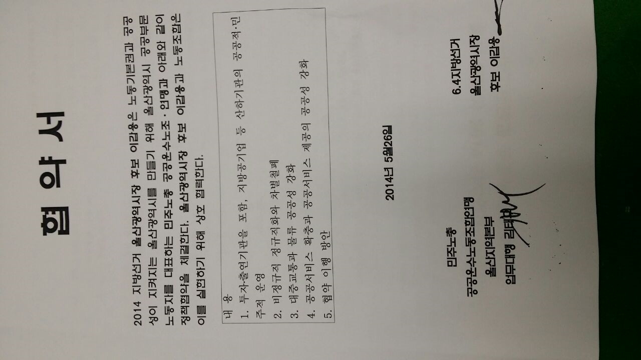 공공운수노조 울산본부는 5월 26일 11시, 시청기자실에서 6.4 지방선거 정책협약식을 가졌다. 노동기본권과 공공성이 지켜지는 울산광역시를 만들기 위해 노동당 울산시장 후보인 이갑용 후보와 정책협약을 맺었다.