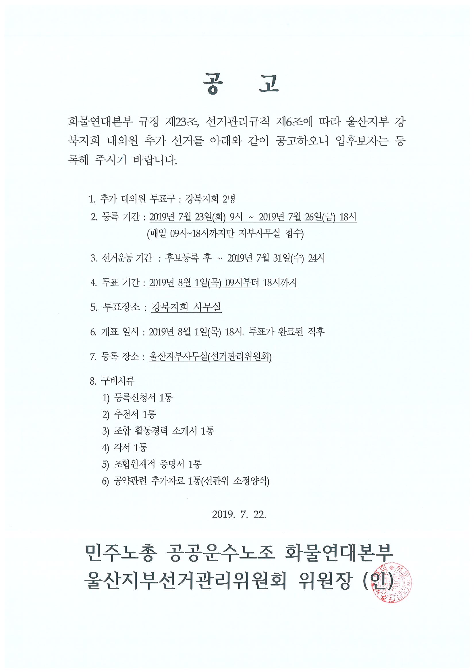 강북지회 대의원 보궐선거 공고 페이지 정보 작성자 오유경 댓글 0건 조회 7,598회 작성일 19-07-22 15:34 목록 본문 이전글울산지부 울주지회 대의원보궐선거 공고 19.07.22 다음글강북지회 덕양산업분회 분회장 보궐선거 공고 19.06.10 댓글 0 댓글목록 등록된 댓글이 없습니다.