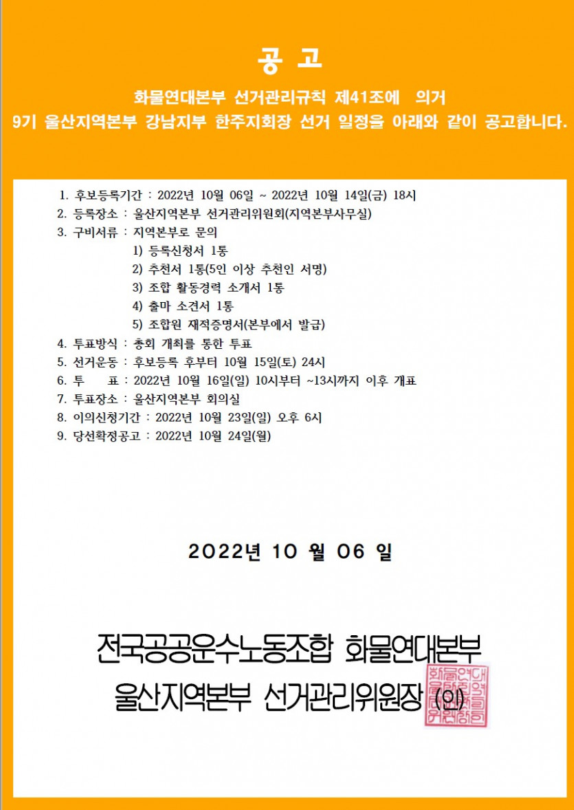 공지 강남지부 한주지회장 보궐선거 공고 페이지 정보 작성자 울산지역본부 댓글 0건 조회 6,638회 작성일 22-10-06 07:29 목록 본문 강남지부 한주지회장 보궐선거를 다음과 같이 공고 합니다 이전글강남지부 3지회 금호수지벌크 분회장 선거공고 22.10.06 다음글강남지부 미선출 분회장 선거 22.08.10 댓글 0 댓글목록 등록된 댓글이 없습니다.