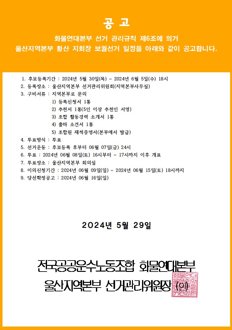 공지사항 울주지부 황산지회장 보궐선거공고 페이지 정보 작성자 울산지역본부 댓글 0건 조회 4,611회 작성일 24-05-29 10:00 목록 본문 이전글울산지역본부 임시대의원대회 소집공 24.09.09 다음글울주지부장 보궐선거공고 24.05.07 댓글 0 댓글목록 등록된 댓글이 없습니다.