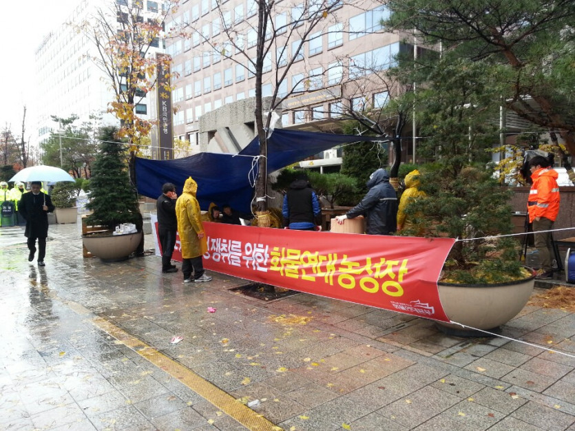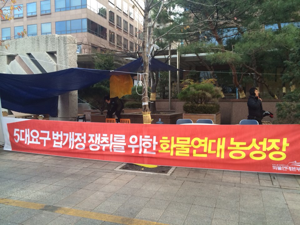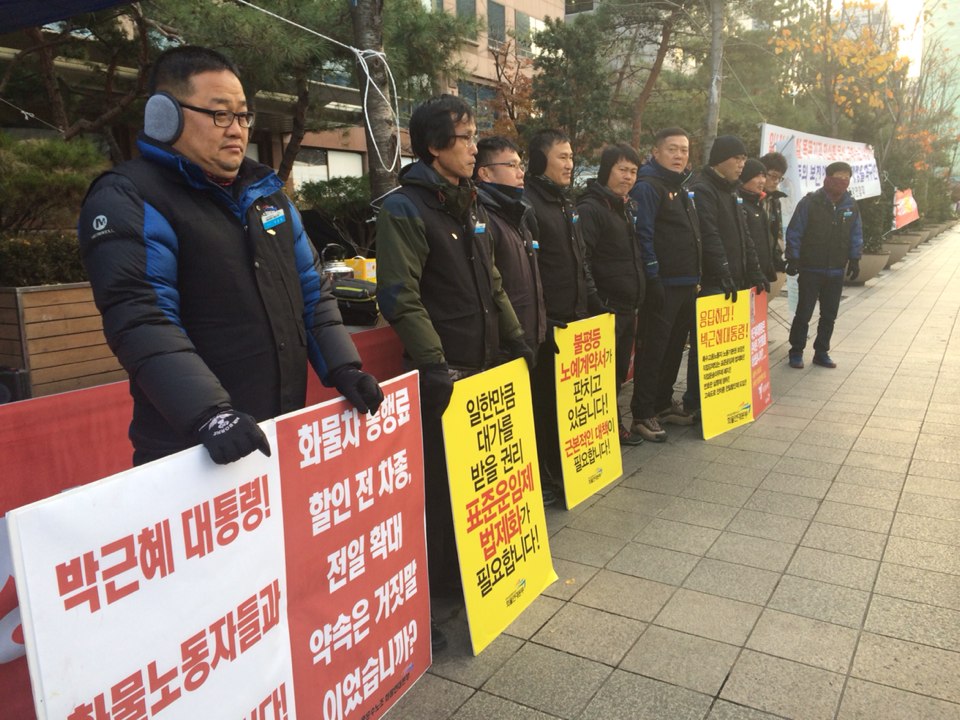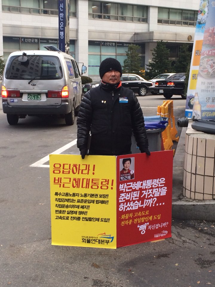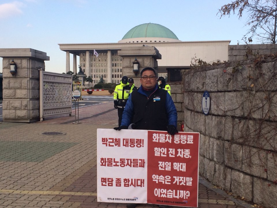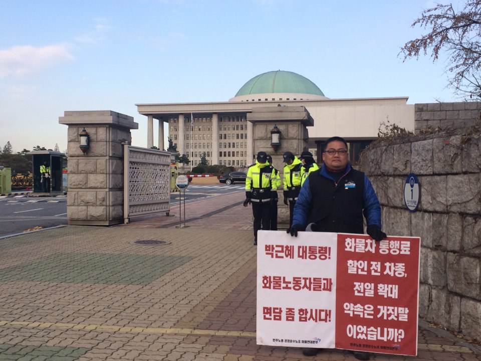 화물연대가 11월 25일(월) 10시 국회앞 여의도 국민은행 앞에서 “표준운임제, 노동기본권 보장, 산재보험 전면적용, 번호판 실명제, 직접운송의무제 폐지, 도로비 인하” 등 법개정을 요구하며 노숙농성에 돌입했다.