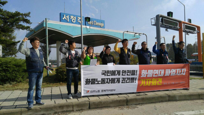 '화물연대 파업 지지 기자회견'을 진행하는 모습.