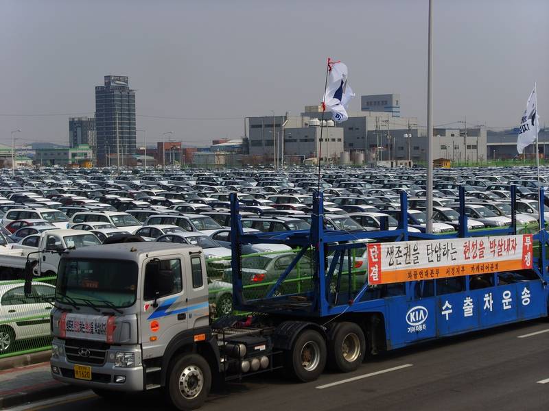 세워진 화물연대 조합원 차량 너머로 카캐리어 화물노동자들이 야적해 놓은 수출차량들이 보인다. 물류의 주체는 우리 화물노동자들이며, 야적 되어진 물류량만 보더라도 우리들 힘의 잠재력을 느낄 수 있다.