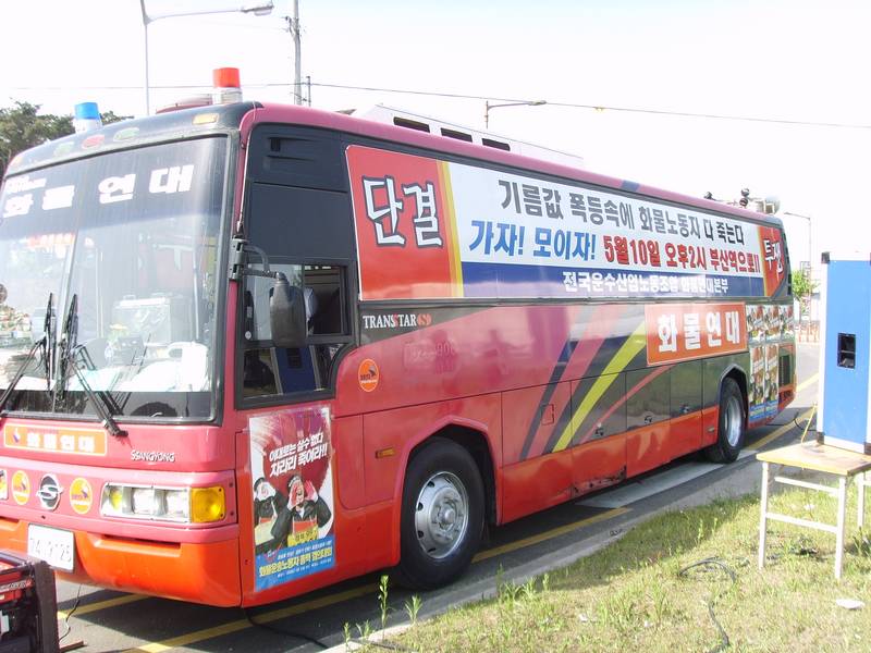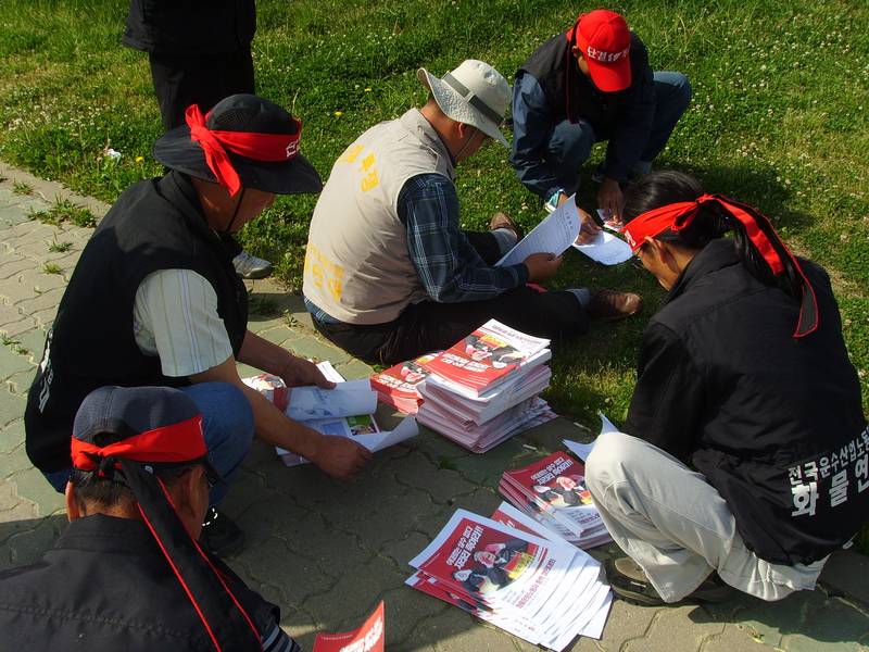 계약해지 철회 투쟁을 벌이고 있는 기아자동차 카캐리어(완성차 운송 트레일러)조합원들이 5.6일 510대회 서경지부선전전을 함께 하고 있다. 유인물을 받는 화물노동자들은 수고한다며 조합원들에게 힘을 실어 주었다.