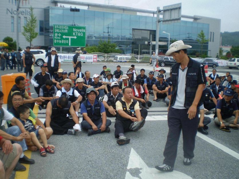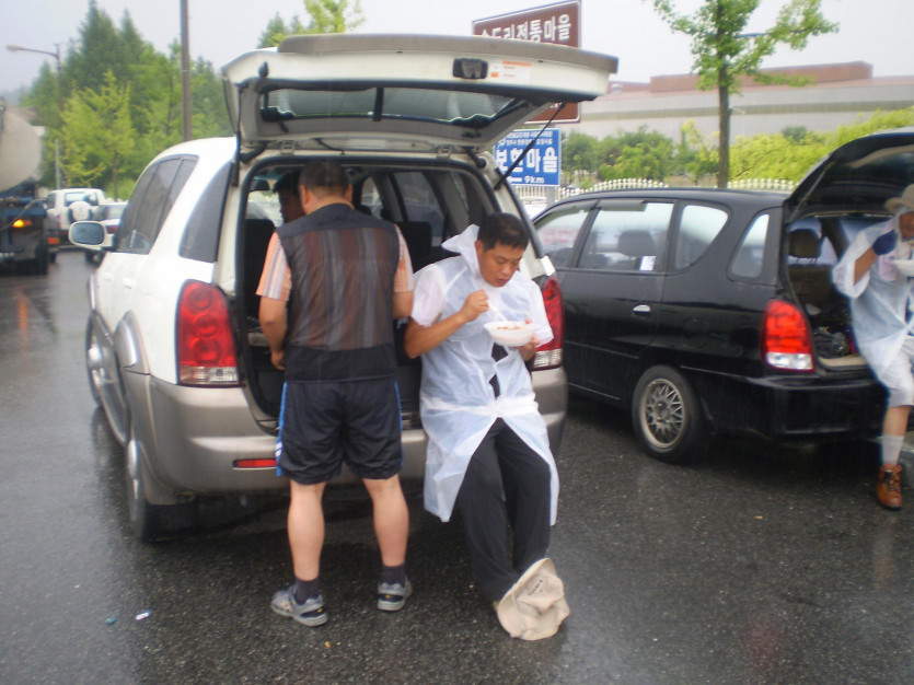 비가 오는 가운데 비를 맞으며 식사를 하고, 가족들을 동원해서 수송차량 저지에 나서다.