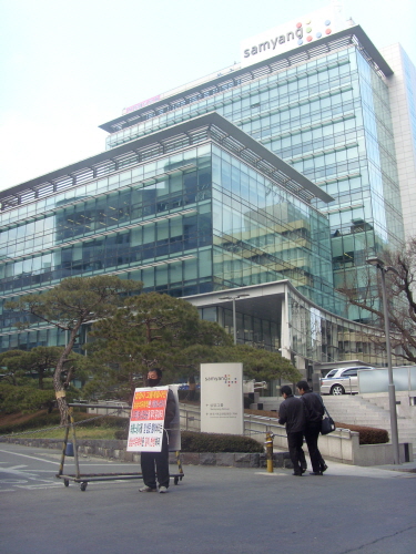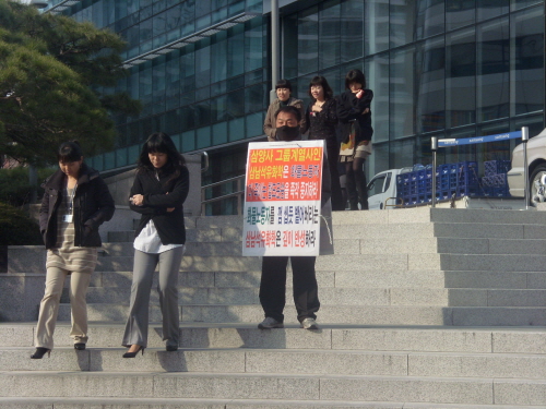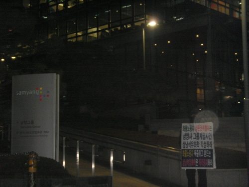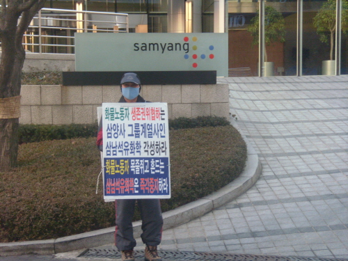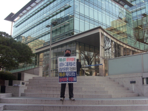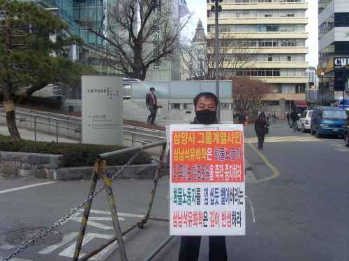 천막농성에 들어간지 16일째...저들에 아무런 변화가 없음에 우린 서울 삼남석유화학의 본사인 삼양사 건물앞에서의 일인피켓 시위에 3명의 동지가 상경하였다...그들의 바쁜출퇴근시간 속에 우린 우리에 처해진 현실을 알리고자 차디찬 콘크리트 바닥위에서...