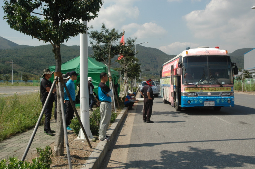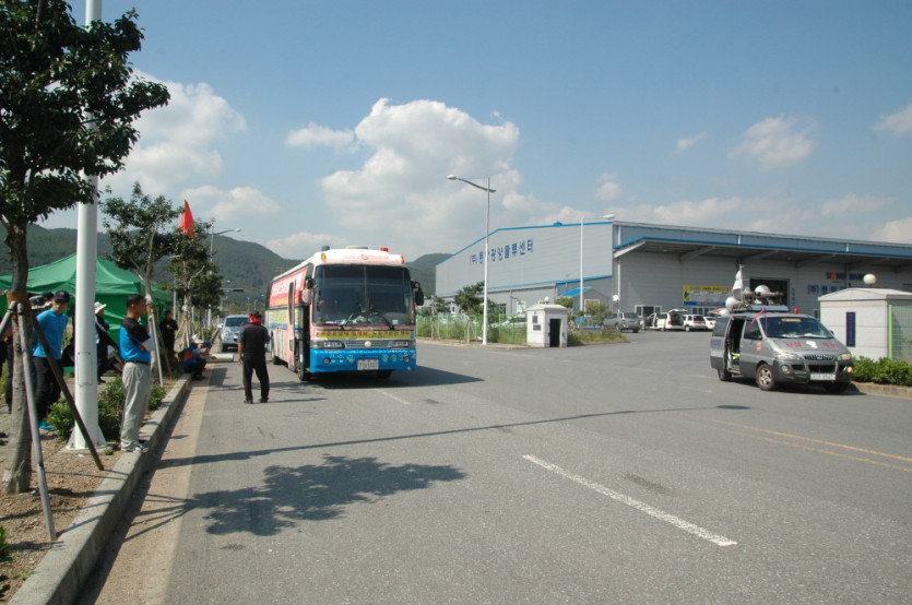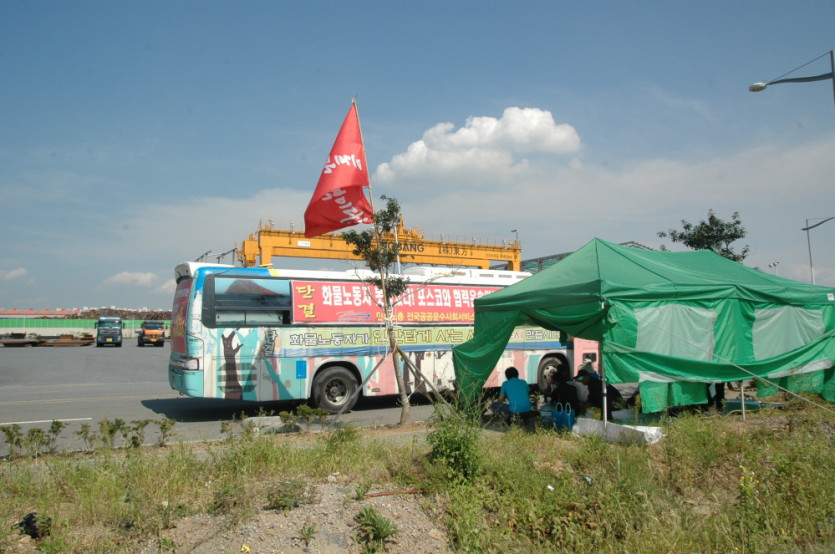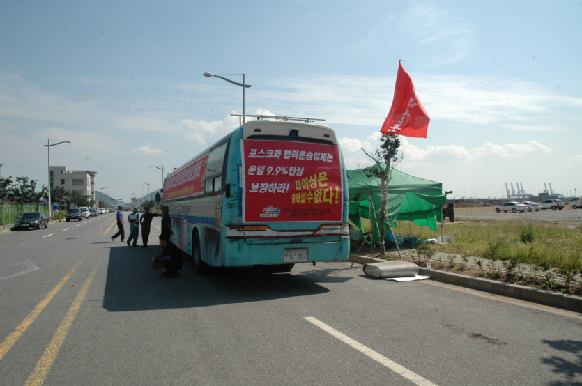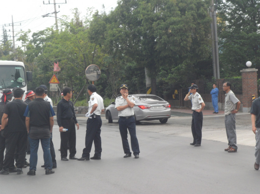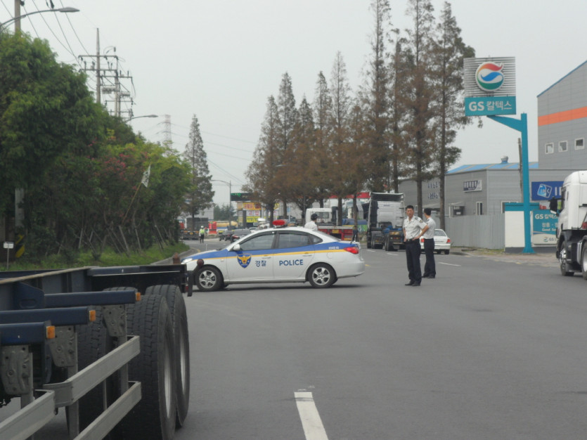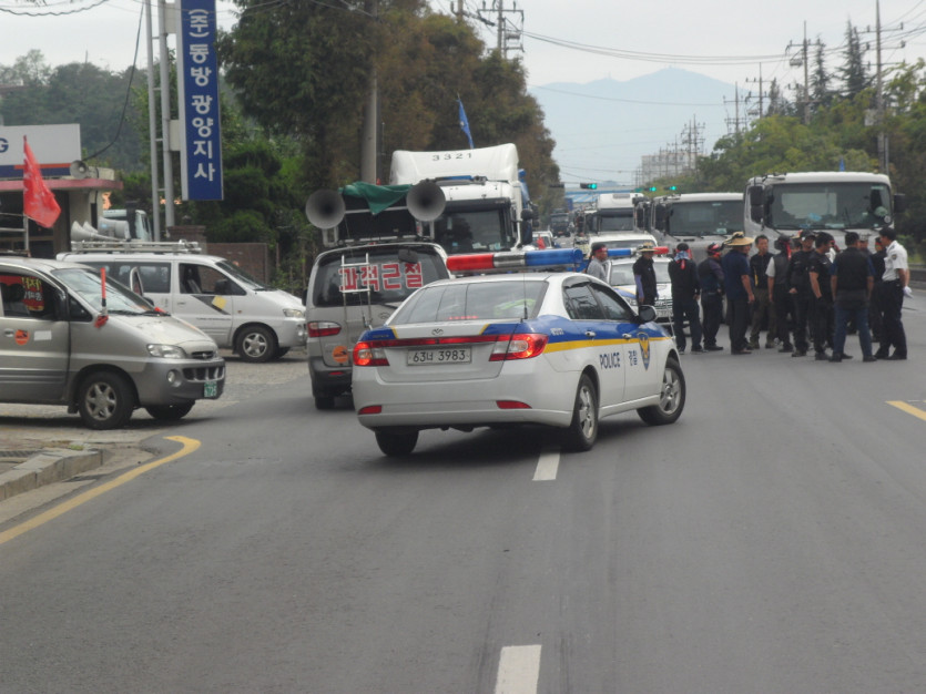 경찰의 비호(캄보이)하에 조합원을 비웃고 운행하는 쪽제비들 .....저는 기사인데요,,,일안하면 짤리는데요,,,,일 안하면 우리 회사 물량이 줄어 드는데요,,,