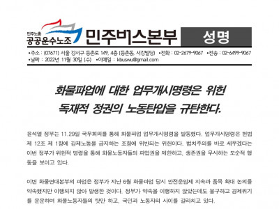 [공공운수노조 민주버스본부]_화물파업에 대한 업무개시명령은 위헌, 독재적 정권의 노동탄압을 규탄한다.