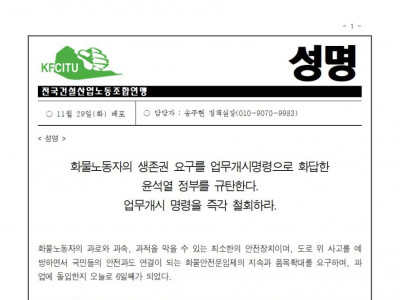[전국건설산업노동조합연맹]_화물노동자의 생존권 요구를 업무개시명령으로 화답한 윤석열 정부를 규탄한다.