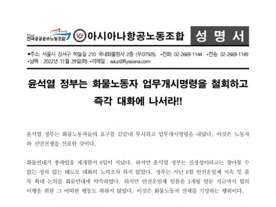 [아시아나항공노동조합]_윤석열 정부는 화물노동자 업무개시명령을 철회하고 즉각 대화에 나서라!