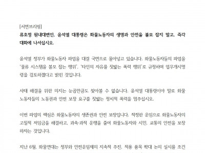 [정의당]_윤석열 대통령은 화물노동자의 생명과 안전을 볼모 잡지 말고, 즉각 대화에 나서십시오.