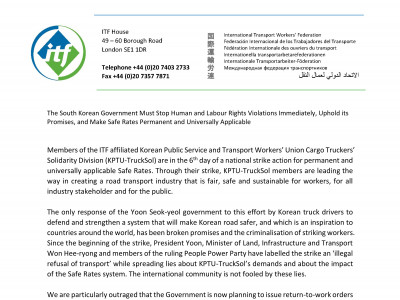 [ITF 국제운수노련]_한국정부에 인권과 노동권 침해를 중단하고, 약속을 이행하고, 영구적이며 보편적으로 적…