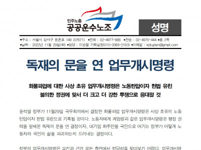 [공공운수노조]_독재의 문을 연 업무개시명령 화물파업에 대한 사상 초유 업무개시명령은 노동탄압이자 헌법 유린…