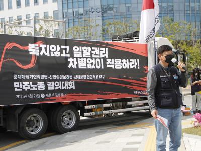 2021.04.21 중대재해기업처벌법 산업안전보건법 산재보험 전면적용 요구 산재 민주노총 결의대회,세종시 청부청사.&nbs..