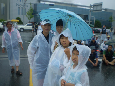 비가 오는 가운데 비를 맞으며 식사를 하고, 가족들을 동원해서 수송차량 저지에 나서다.