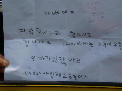 조합원의 6살 먹은 아들이 편지를 써서 아빠에게 전달하다. 모두 힘내서 단결 투쟁~~