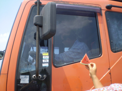 엄청난 더위 속에 수십여대의 차들이 몰려 왔다. 오늘은 평화적으로 같은 업계의 화물운송자들을 위해 달고, 맛있는 수박..