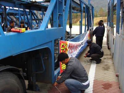 차량에 투쟁의 요구를 담은 프랑카드를 조합원들이 부착하고 있다.