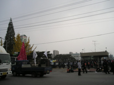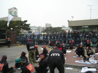 경찰이 연대차량의 공장인근 접근을 막으면서 실갱이.. 집회 초반에 구사대와 한국노총 쪽 놈들하고 실력행사가 있었다고 합..