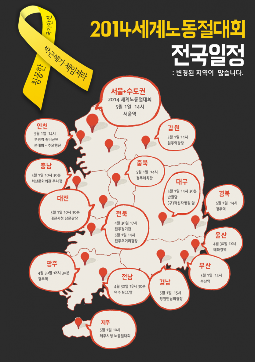 민주노총 중앙집행위원회는 4월 24일 회의를 개최하여, 2014 5.1절 세계노동절대회와 관련해서 민주노총은 5.1 전국동시다발로 노동절대회를 예정대로 진행하고, 조합원 조직에 총력을 기울이기로 하였다.