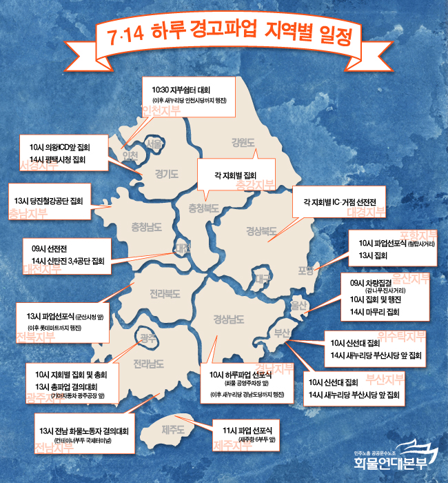 본부는 7월 14일 진행되는 “화물연대 7.14 하루 경고 파업”이 전국 15개 지부별로 진행을 점검 한 결과 순조롭게 진행되고 있는 것으로 파악되었다. 전국 15개지부는 하루 경고 파업인 14일에 각 지부별로 집회와 행진을 계획하고 있는 것으로 들어났으며, 하루 경고 파업을 조직하기 위해 지부는 총력적인 선전전에 돌입해있는 상태이다.