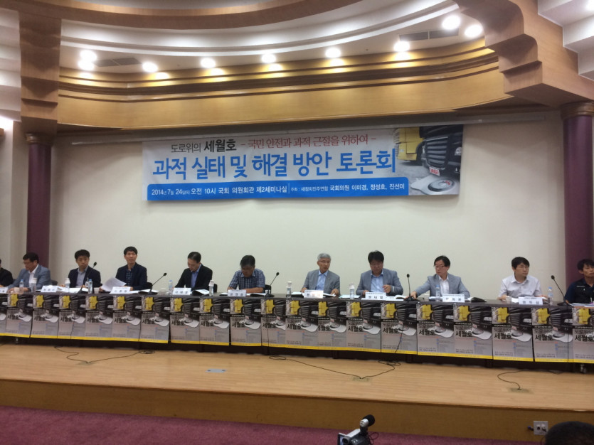 세월호 참사 100일째 되는 날. 국회에서는 “도로위에 세월호” 화물자동차 과적 근절 방안을 모색하는 토론회가 개최되었다. 국회의원 이미경의원(국토위)과, 진선미의원(안행위), 정성호의원(국토위) 세명의 주최로 열린 이날 토론회는 오전 10시에 국회의원회관 제2세미나실에서 개최하기로 되어있었으나, 너무 많은 인원들이 참석하는 관계로 2층 소회의실로 옮겨서 진행되었다.