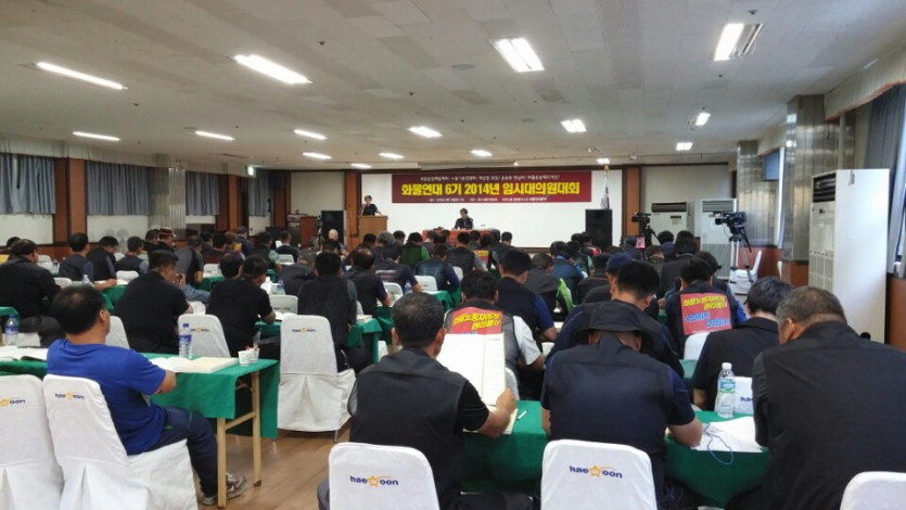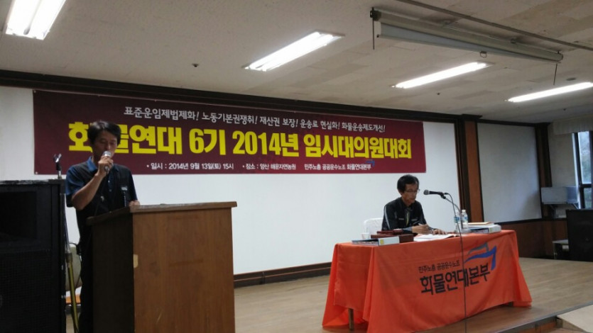 화물연대 임시대의원대회가 9월 13일 (토) 69명의 대의원이 참가한 가운데 양산해운자연농원에서 진행되었다. 대회사에서 이봉주 본부장은 “정부가 세월호 국면을 계기로 우리 요구를 모두 들어줄 것처럼 행동했지만, 국면이 지나면서 화물연대의 요구를 헌신짝 버리듯 버리려고 하고 있다. 정부와의 약속, 손아귀에 움켜쥘 수 있을 것 같았던 요구안들 날아가게 생겼다.”면서 “이제 곧 11월, 12월 국회가 다시 열릴 것이다. 정부에서 해줄 때까지 기다린다면 작은 성과마저도 날아갈 것이다. 그래서 금년 하반기, 바로 모레 15일부터 전국을 도는 순회 선전전을 시작할 것이고, 투쟁의 깃발을 높이 세울 것이다. 우리가 핍박받지 않을 법안, 우리 손아귀까지 온 법안 움켜쥐자”고 말했다.