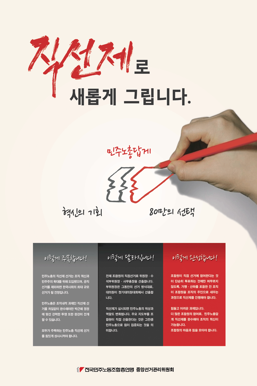 오는 12월 3일부터 9일까지 민주노총 위원장, 수석부위원장, 사무총장을 조합원 직접선거(이하 직선제)로 선출하는 민주노총 직선제가 실시된다.