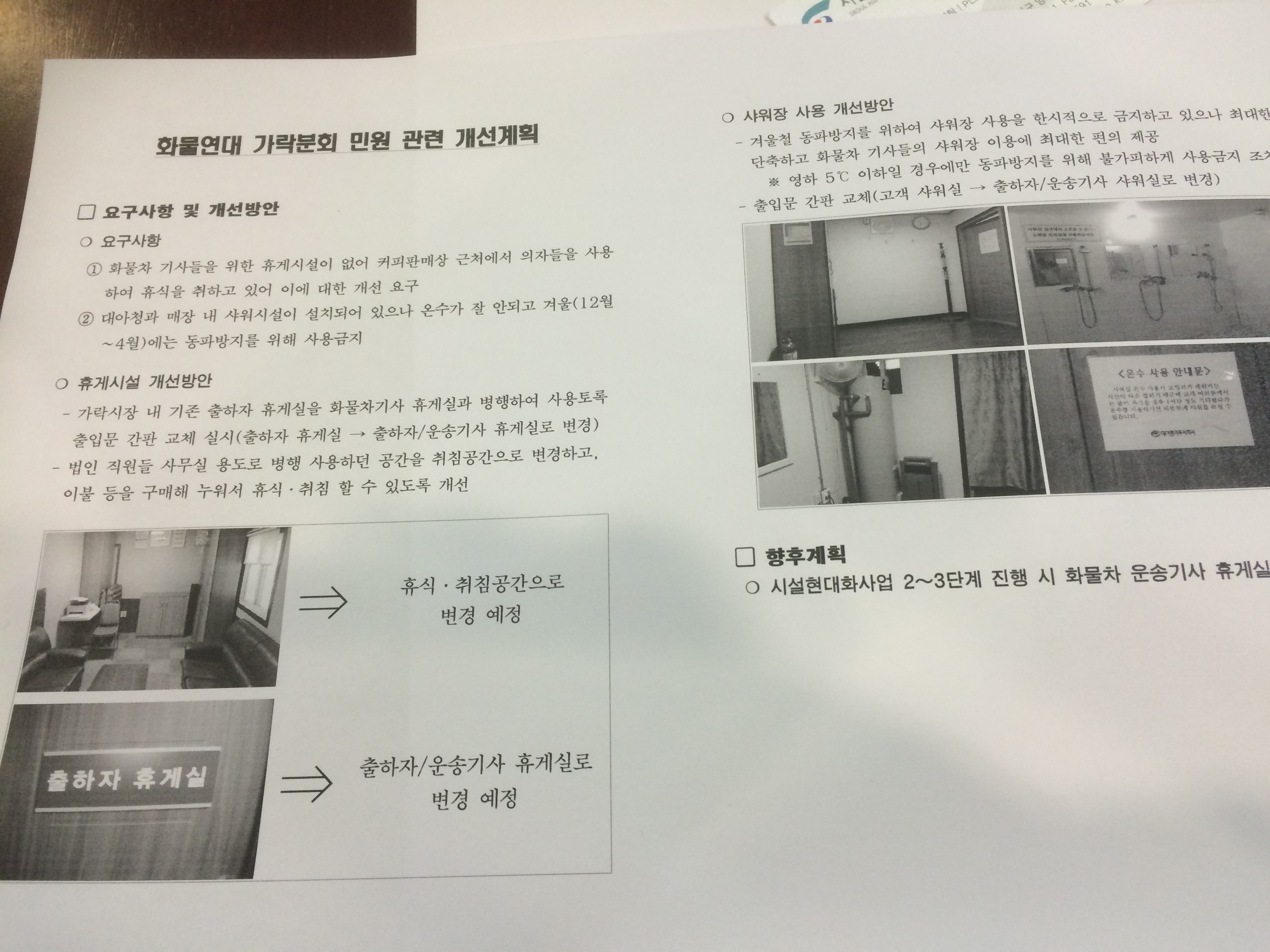 특히나 화물노동자들의 샤워를 위해 저수용량을 확대와 빨래를 위해 세탁기 설치 등을 주문하였고, 공사측은 ‘적극적으로 하겠다’라고 답변하였다. 가락동분회는 또한 분회와 공사간의 정례적인 간담회를 요구하였고, 이에대해 공사는 중도매인과 대아매장 관계자 등에게 참석을 권유하도록 하겠으며, 다음주중으로 분회 교육부장과 먼저 소통하고 간담회 일정을 잡는 것으로 하고 이날 간담회는 마무리되었다.