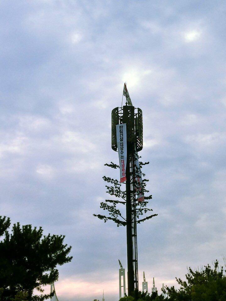 10일 새벽 경남 창원시청 광장 위 KBS사거리 용지문화공원 송신탑위에 경남지부 동양파일 백문흠, 김철규 조합원이 고공농성에 돌입했다.