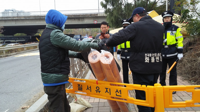 화물연대본부 충북지부 음성진천지회 풀무원분회 소속인 연제복, 유인종 동지는 지난 10월 24일 새벽, 풀무원부회의 파업투쟁 승리를 위해 여의2교 부근 광고탑에 올라 고공농성에 돌입했다. 고공농성이 34일째에 접어든 데다, 눈비가 내리는 등 갑작스런 날씨 변화로 서울 기온이 영하로 떨어지면서 고공농성 중인 동지들의 건강이 심히 걱정되는 상황이었다.