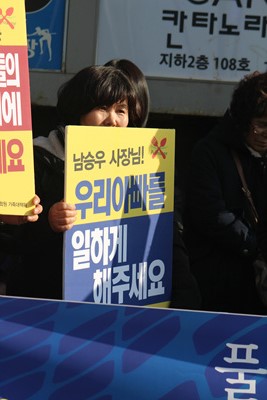 89일차 파업투쟁, 39일째 고공농성을 진행중인 풀무원분회 조합원 가족들이 수줍게 기자회견을 위해 피켓을 들었다. 이들은 답답하고 화도 나고 걱정이 태산인것이 얼굴에 역력했다. 추운날씨 고공에서 농성하고 있는, 아이들 얼굴본지 3개월도 넘은 남편과 자식들이 건강은 괜찮은지 밥은 잘먹고 있는지 울먹이며 말문을 열었다.